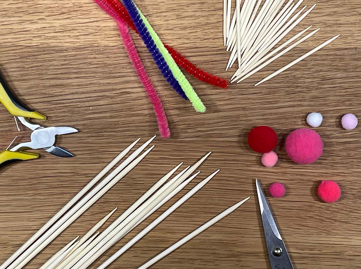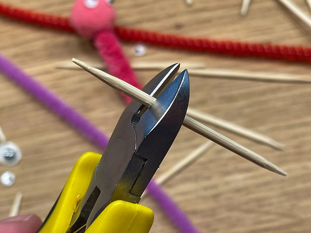 Hier besteht Verletzungsgefahr, da die Zahnstocher weit fliegen, wenn sie beim Durchschneiden nicht festgehalten werden. Helfe deinen Kindern dabei, da es zudem einiges an Kraft benötigt, die Zahnstocher zu teilen. Anstelle der Schere kannst du auch eine Zange nutzen.