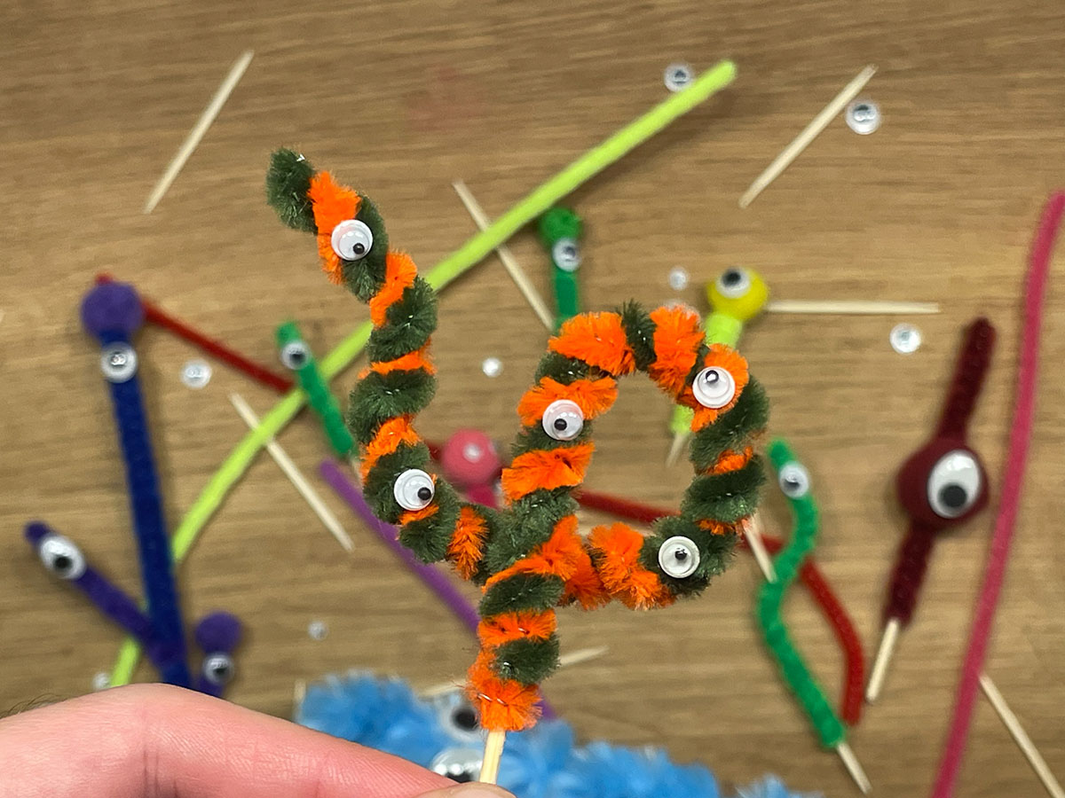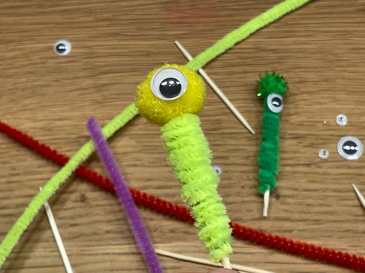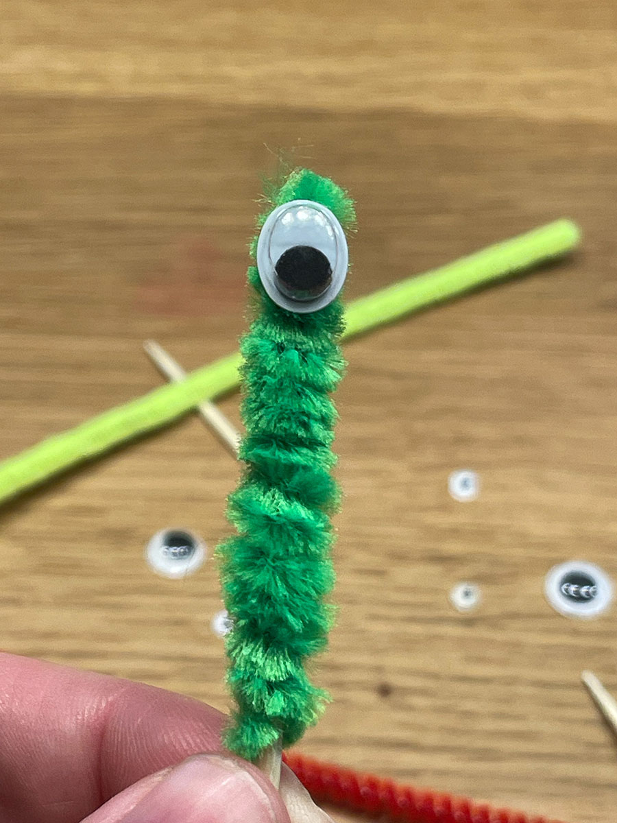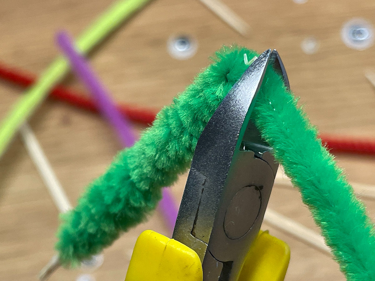 Kürze nach Bedarf mit der Schere/Zange den Pfeifenputzer. Alternativ kannst du den Pfeifenputzer einfach wieder zurück nach unten über den Zahnstocher wickeln.