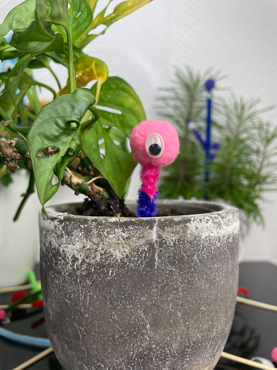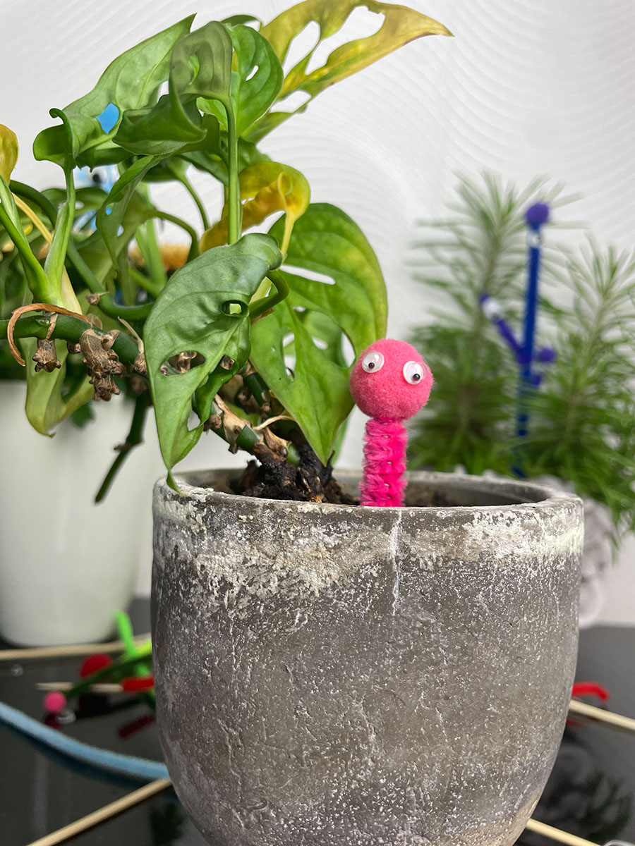 Lasse unten am Zahnstocher etwas frei, damit du die Monsteraugen in die Blumenerde stecken kannst.