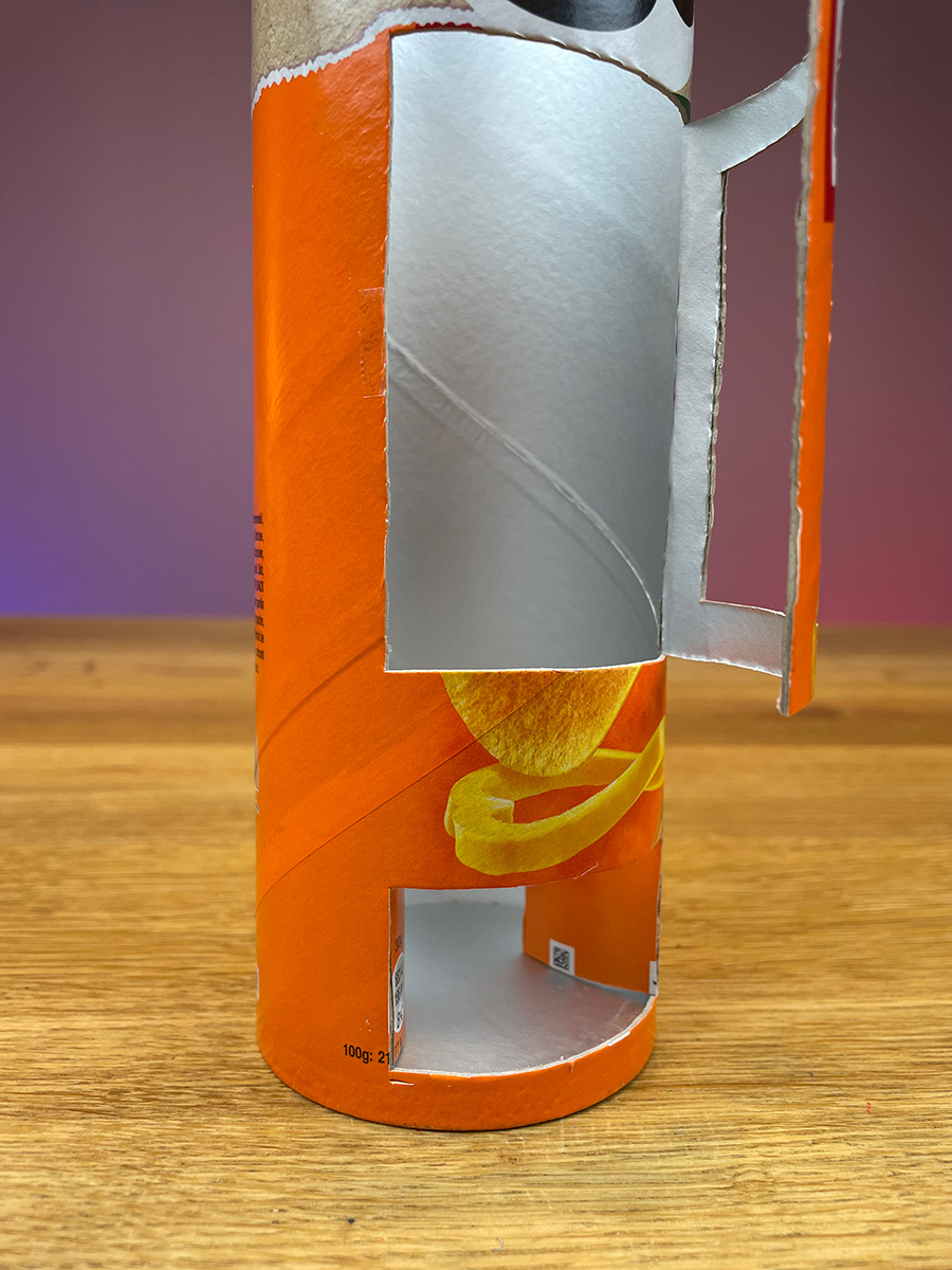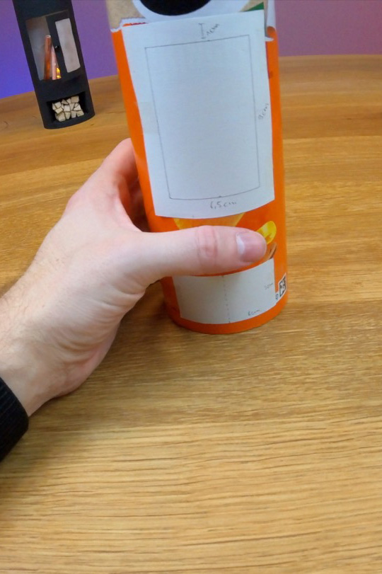 Zunächst müssen alle Öffnungen in die Chipsdose geschnitten werden. Da die Dose rund ist, empfehle ich, vorab eine Schablone mit den entsprechenden Maßen auszuschneiden und aufzulegen. So lassen sich die Schnittlinien deutlich einfacher und präziser einzeichnen.