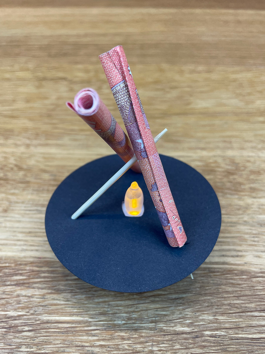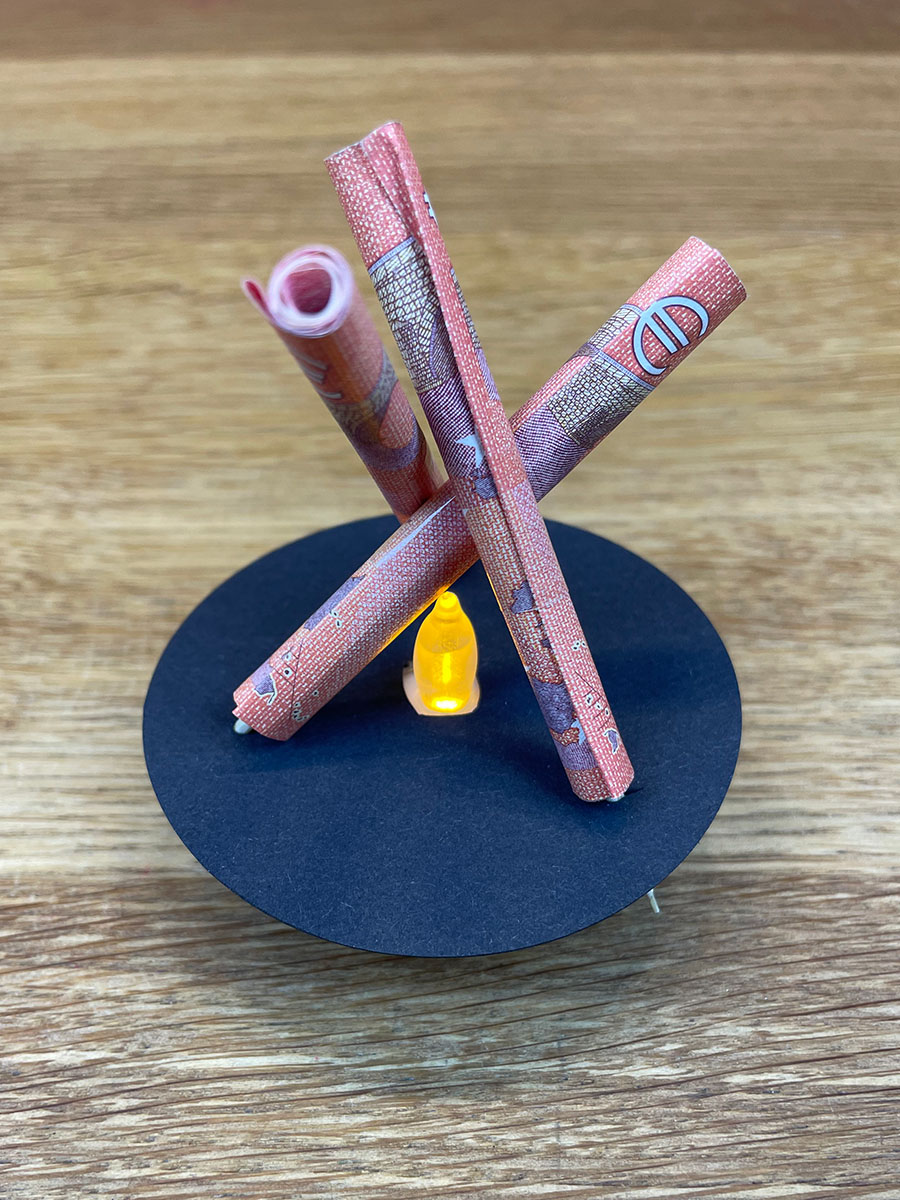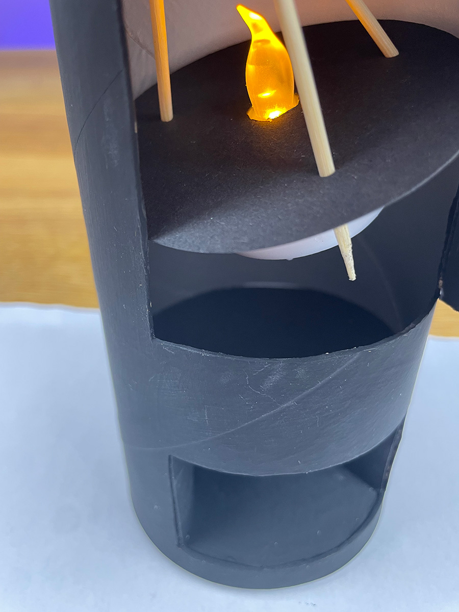 Tipp: Um das Teelicht an- oder auszuschalten, hebe die Geldscheine samt Zahnstochern durch die Kamintür leicht an und gelange so von unten an die Kerze.