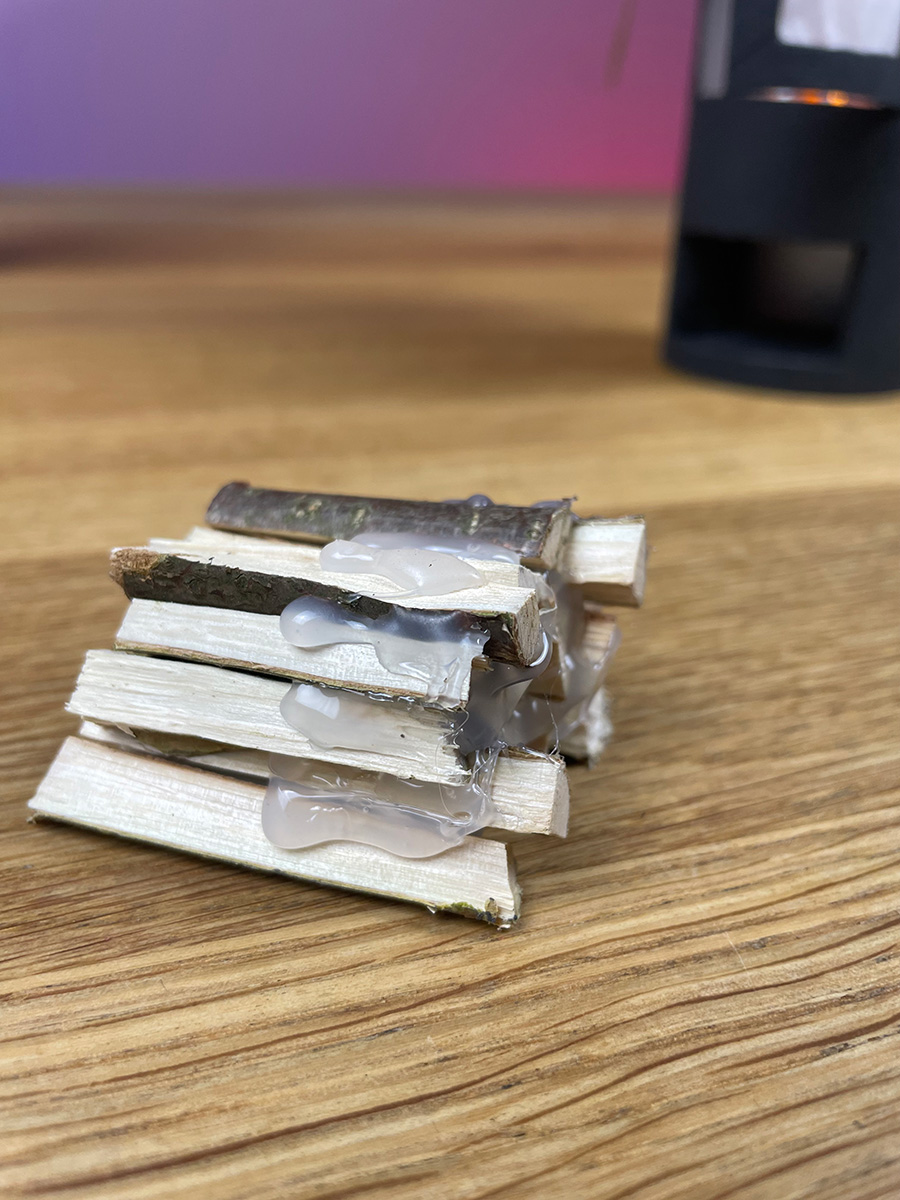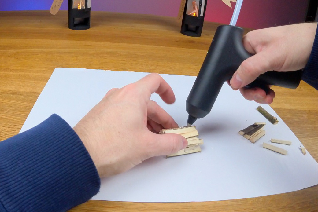 Prüfe zunächst, ob das Holzbündel problemlos in die Öffnung passt. Gib anschließend etwas Heißkleber auf die hinteren unteren Ecken des Bündels und fixiere es in der Öffnung.