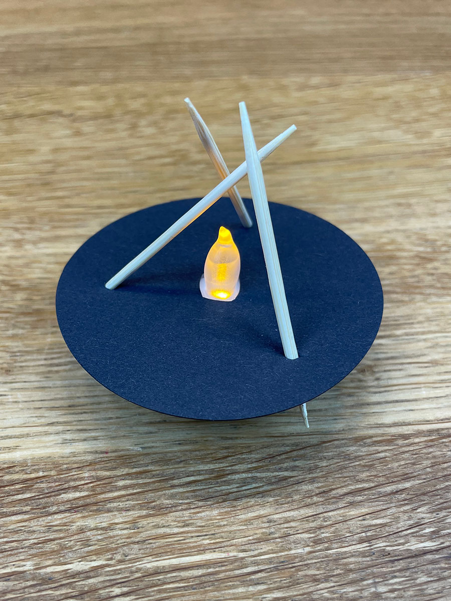 Steche in den zweiten Kreis drei kleine Löcher. Am besten kannst du diese mit der Spitze des Cutters vorstechen. Stecke die Zahnstocher hindurch und richte sie leicht schräg zueinander aus, sodass sie später wie aneinander gelehnte Holzscheite wirken.