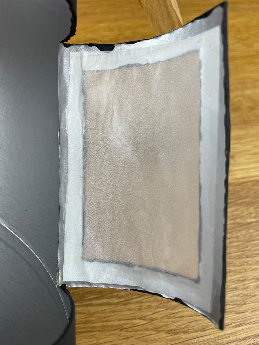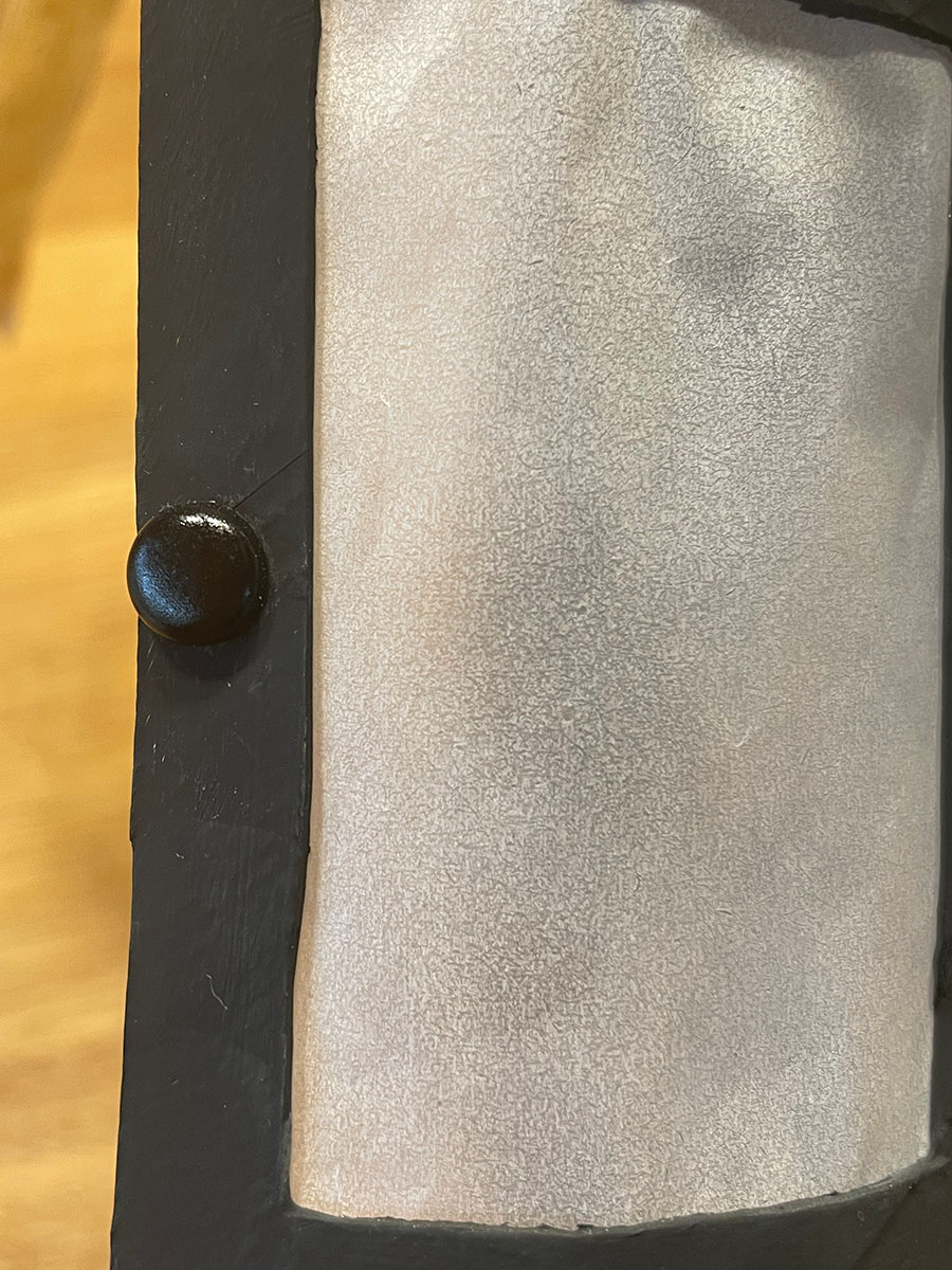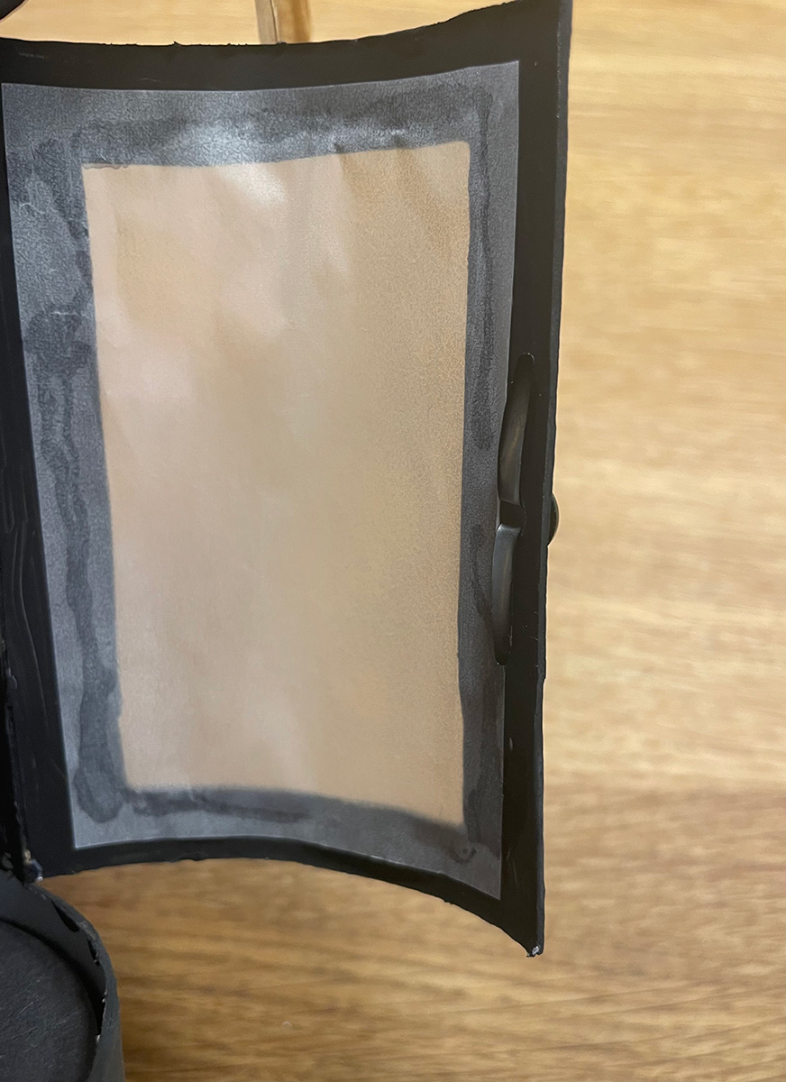 Schneide ein Stück Transparentpapier zu, das die Kamintür vollständig abdeckt. In meinem Fall ist es ca. 5,5 x 8,5 cm. Klebe es anschließend von hinten mit Flüssigkleber an die Innenseite der Tür.