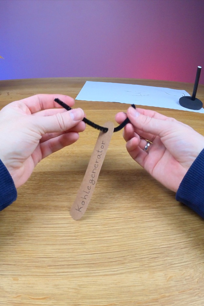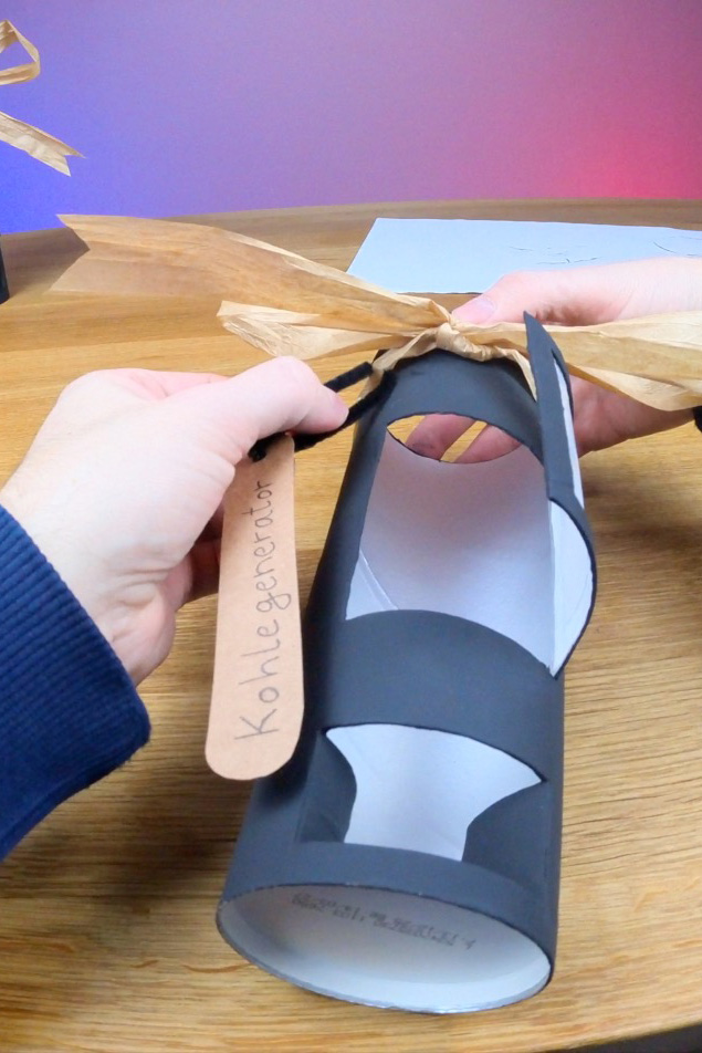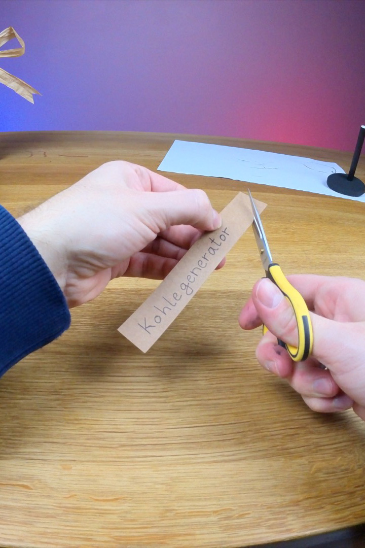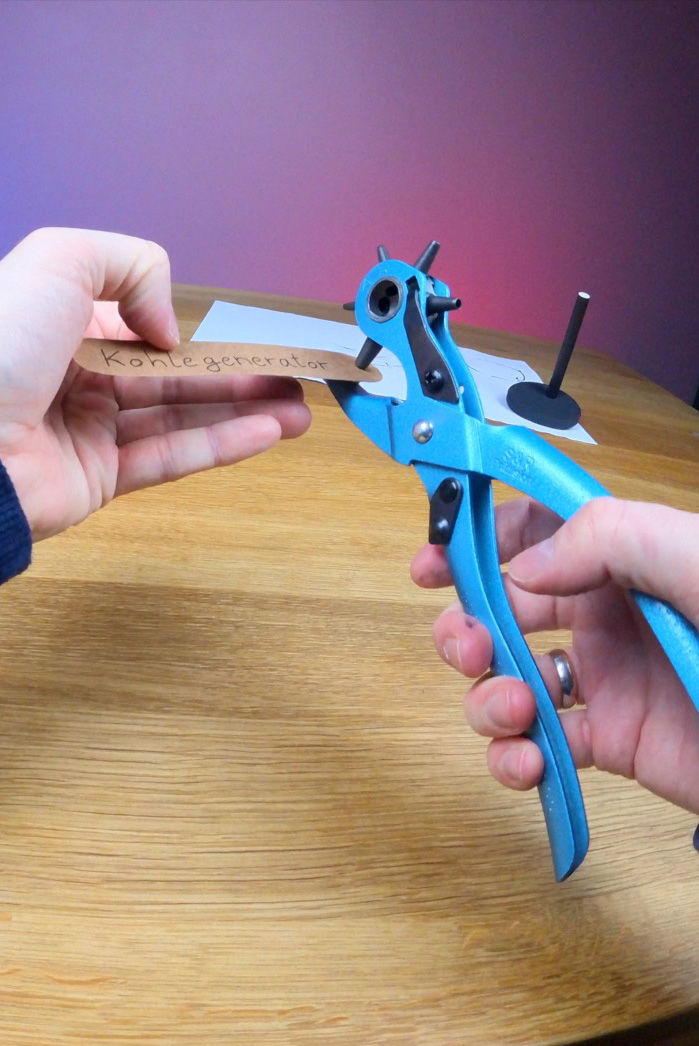 Schreibe deinen gewünschten Schriftzug – zum Beispiel „Kohlegenerator“ – auf ein Stück Kraftpapier, schneide es aus und versehe es mit einem kleinen Loch.