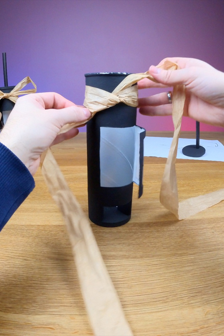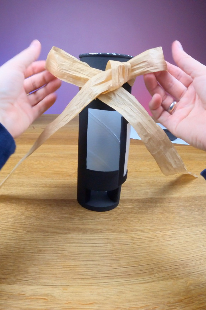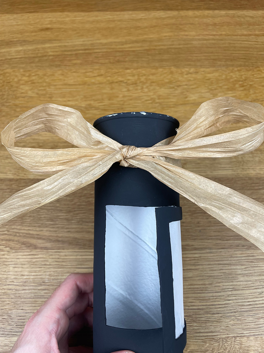 Für eine formstabile Schleife, die ihre Form behält und nicht an den Seiten herabhängt, habe ich ein Stück Bastband auseinandergefaltet und daraus eine Schleife gebunden. Diese lässt sich perfekt zwischen Kamintür und Deckel platzieren.