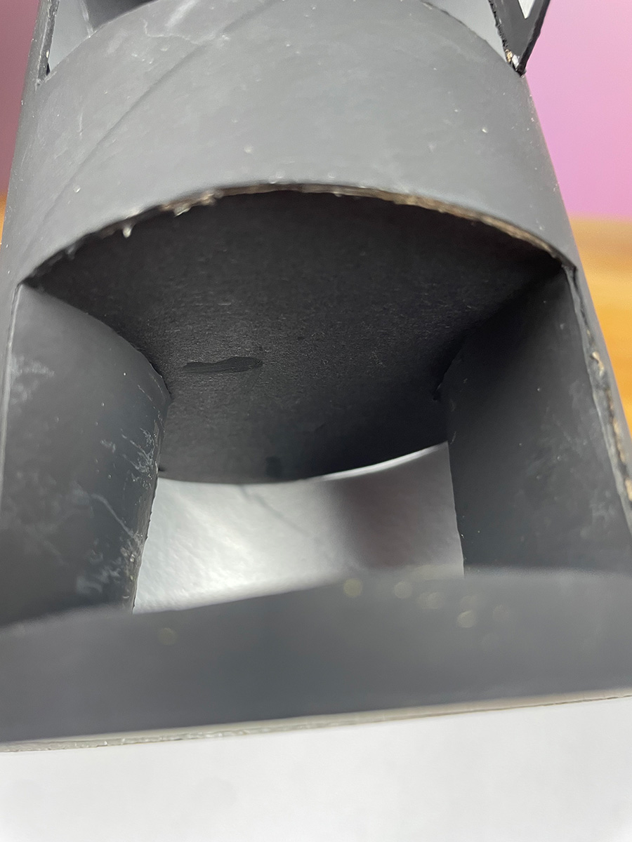 Beginne vorsichtig mit dem Cutter und prüfe zwischendurch von innen, ob die Höhe stimmt und die Messerspitze sichtbar ist. Die ausgeschnittenen Elemente sollten wie ein doppelseitiges Tor nach innen klappbar bleiben. Sie geben dem Innenleben zusätzliche Stabilität. Ritze das Scharnier leicht an, um das Ein- und Ausklappen zu erleichtern. Öffne die Klappe dazu zunächst nach außen, damit du das Scharnier auch von innen anritzen kannst.