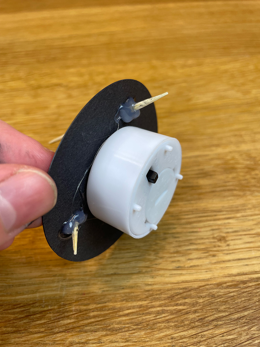 Befestige die Zahnstocher anschließend mit der Heißklebepistole am Kreis und klebe den Kreis mit den Zahnstochern auf das Teelicht.