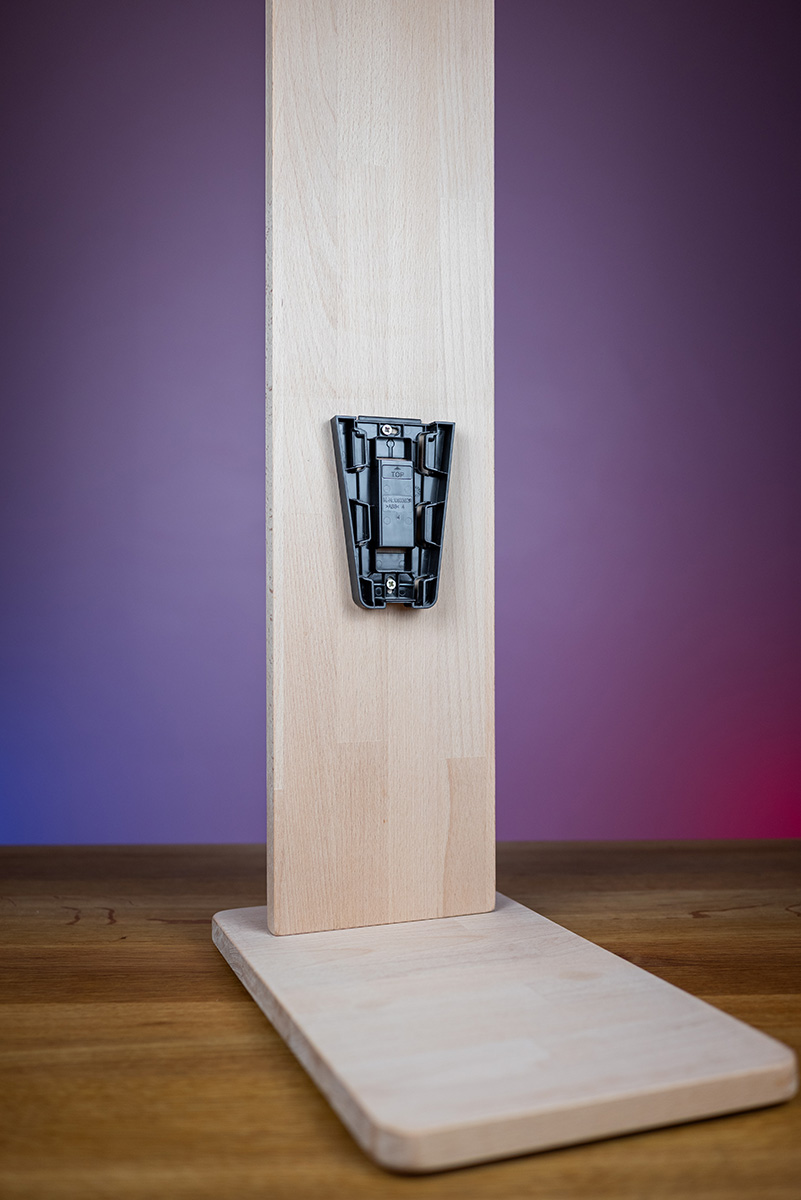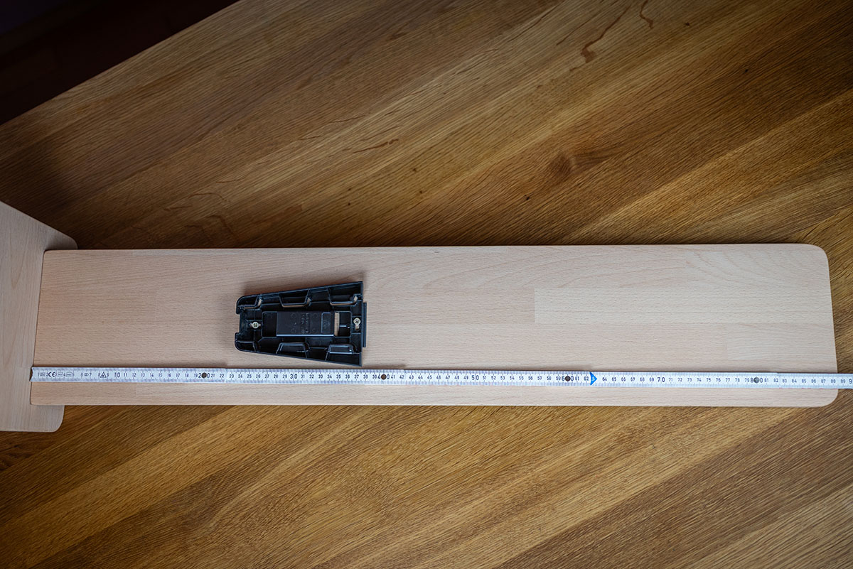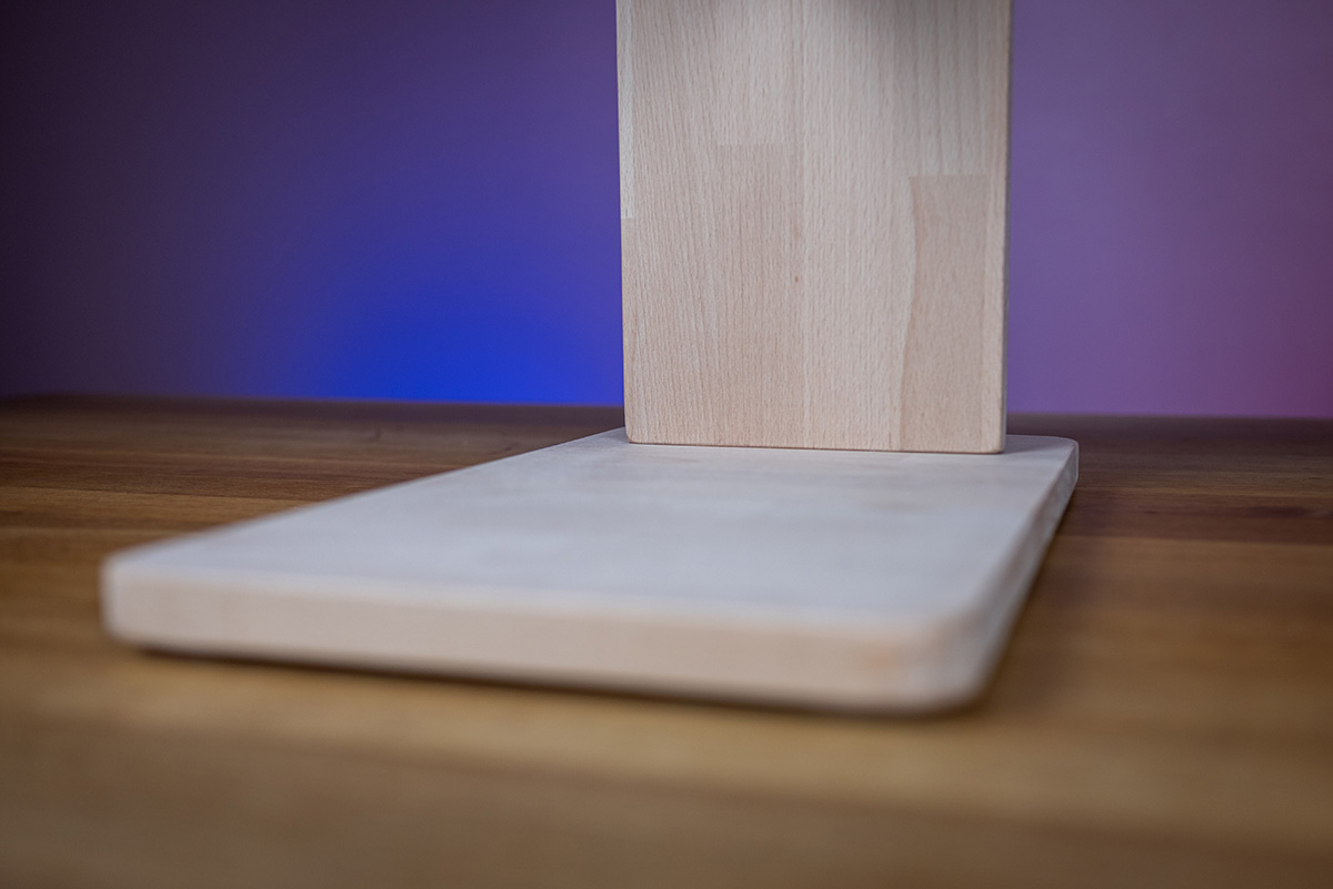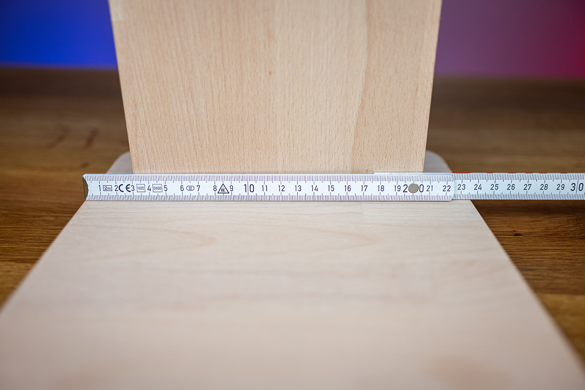 Das senkrechte Brett wird mittig auf dem Fuß ausgerichtet und etwa 6 cm vom hinteren Rand entfernt positioniert. Die Bohrlöcher werden von unten vorgebohrt, sodass die Schrauben ebenfalls von unten eingedreht werden können. Auf diese Weise bleiben sie später vollständig unsichtbar.