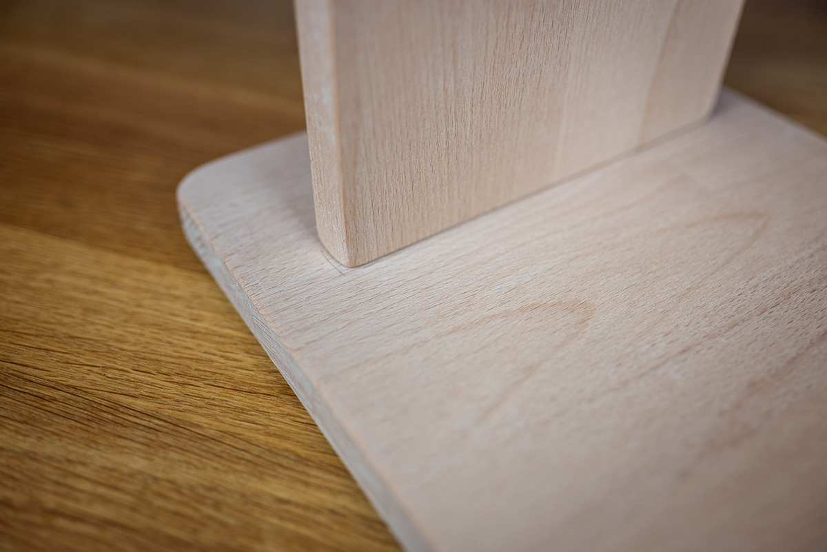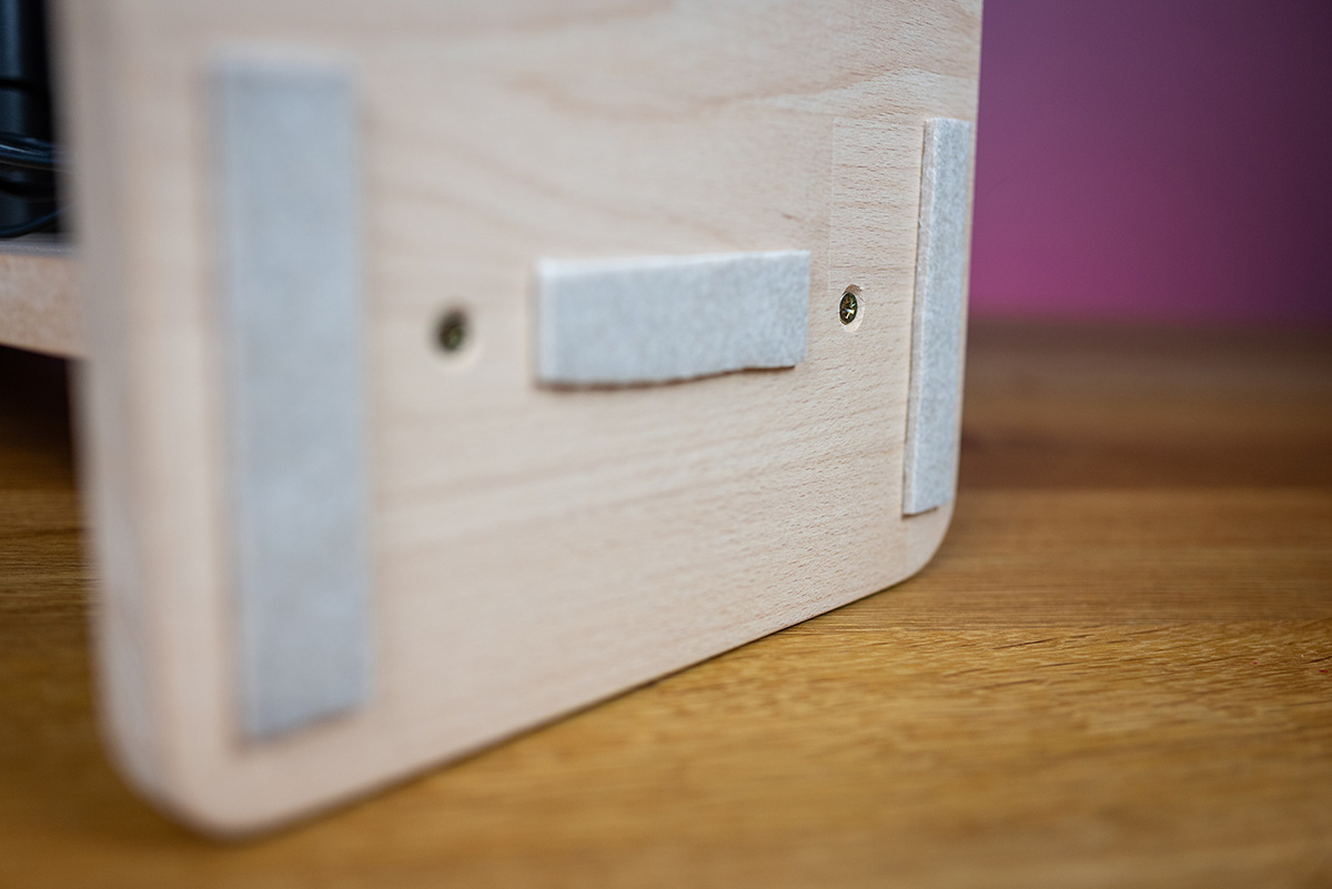 Für ein sauberes und professionelles Ergebnis empfiehlt es sich, die Bohrlöcher mit einem Holzsenker leicht zu versenken, damit die Schraubenköpfe bündig im Holz versinken. Abschließend werden Filzgleiter unter dem Fuß angebracht, um den Boden vor Kratzern zu schützen und einen sicheren, rutschfesten Stand zu gewährleisten.