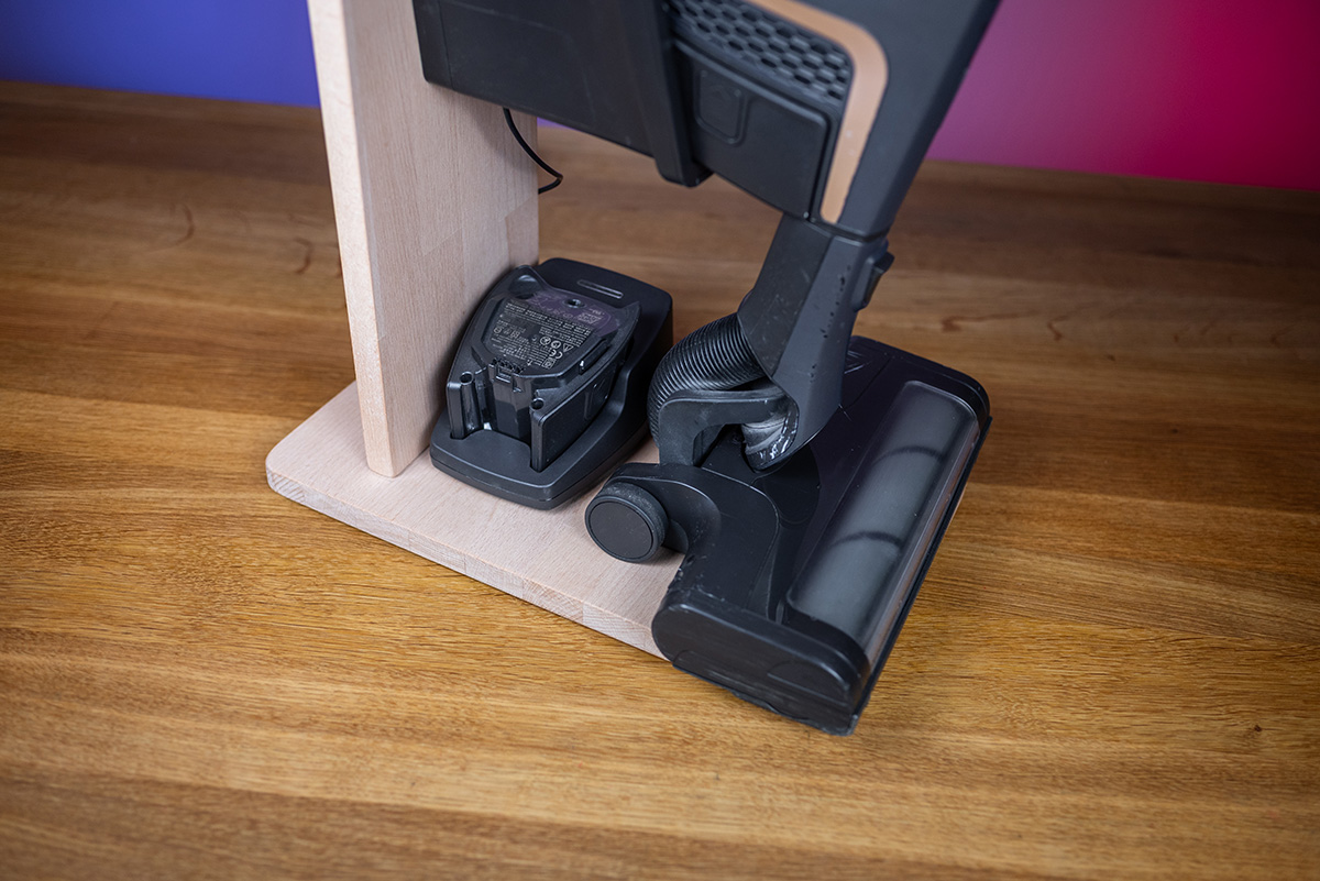 Unser Staubsauger ist modular aufgebaut und kann grundsätzlich beide Varianten bedienen. Da er jedoch über längere Zeit frei stehen musste, hatten wir uns im Alltag an die untere Positionierung gewöhnt und diese als deutlich praktischer empfunden. Eine bezahlbare und zugleich optisch ansprechende Lösung für eine tiefer sitzende Befestigung der Ladeschale ließ sich allerdings nicht finden.
