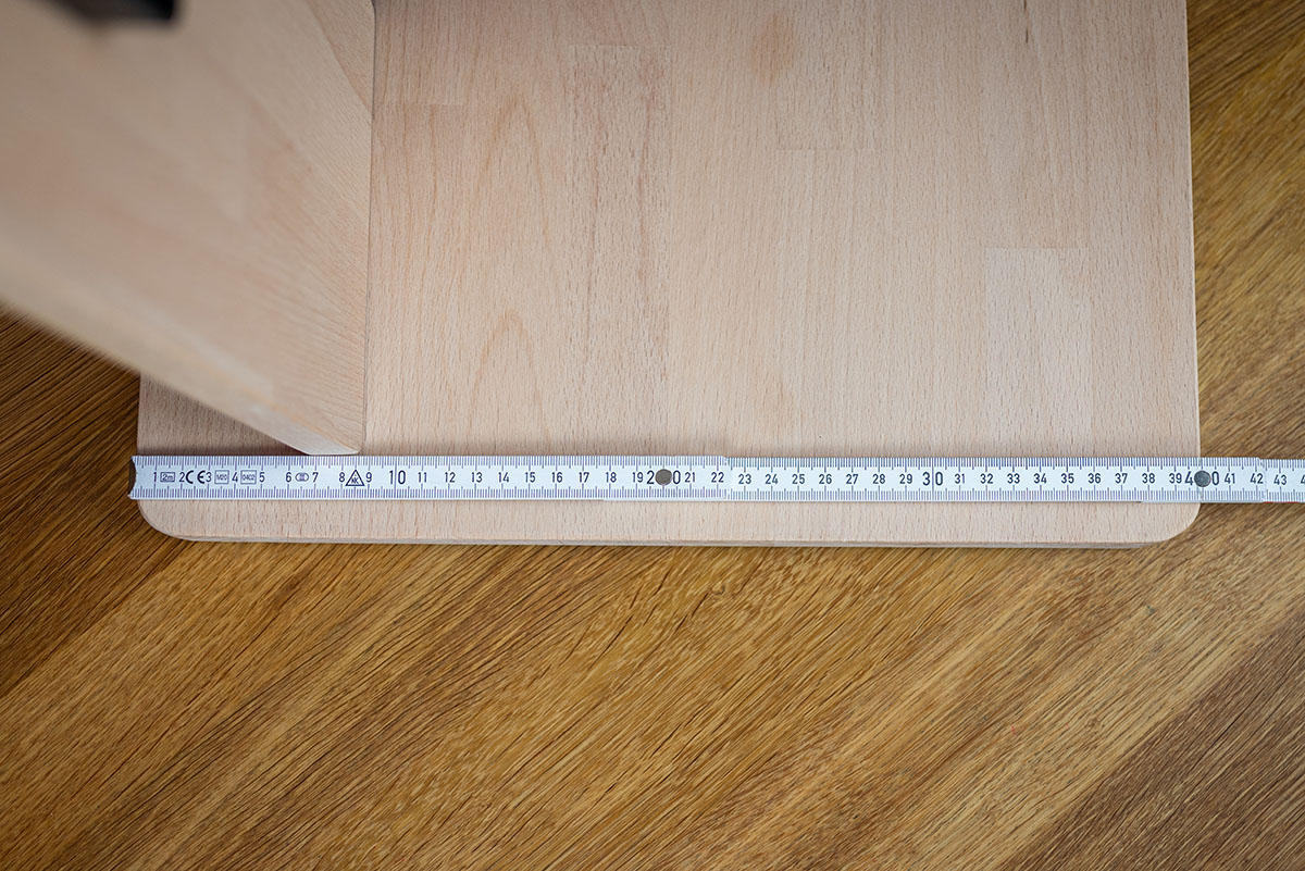 In diesem Beispiel ist das senkrechte Holzstück etwa 90 cm hoch und 18 cm breit. Der Fuß misst rund 40 cm in der Länge und ist mit 24 cm bewusst etwas breiter als das aufrechte Brett ausgeführt. Das Holz kann entsprechend zugeschnitten oder direkt in den passenden Maßen besorgt werden.